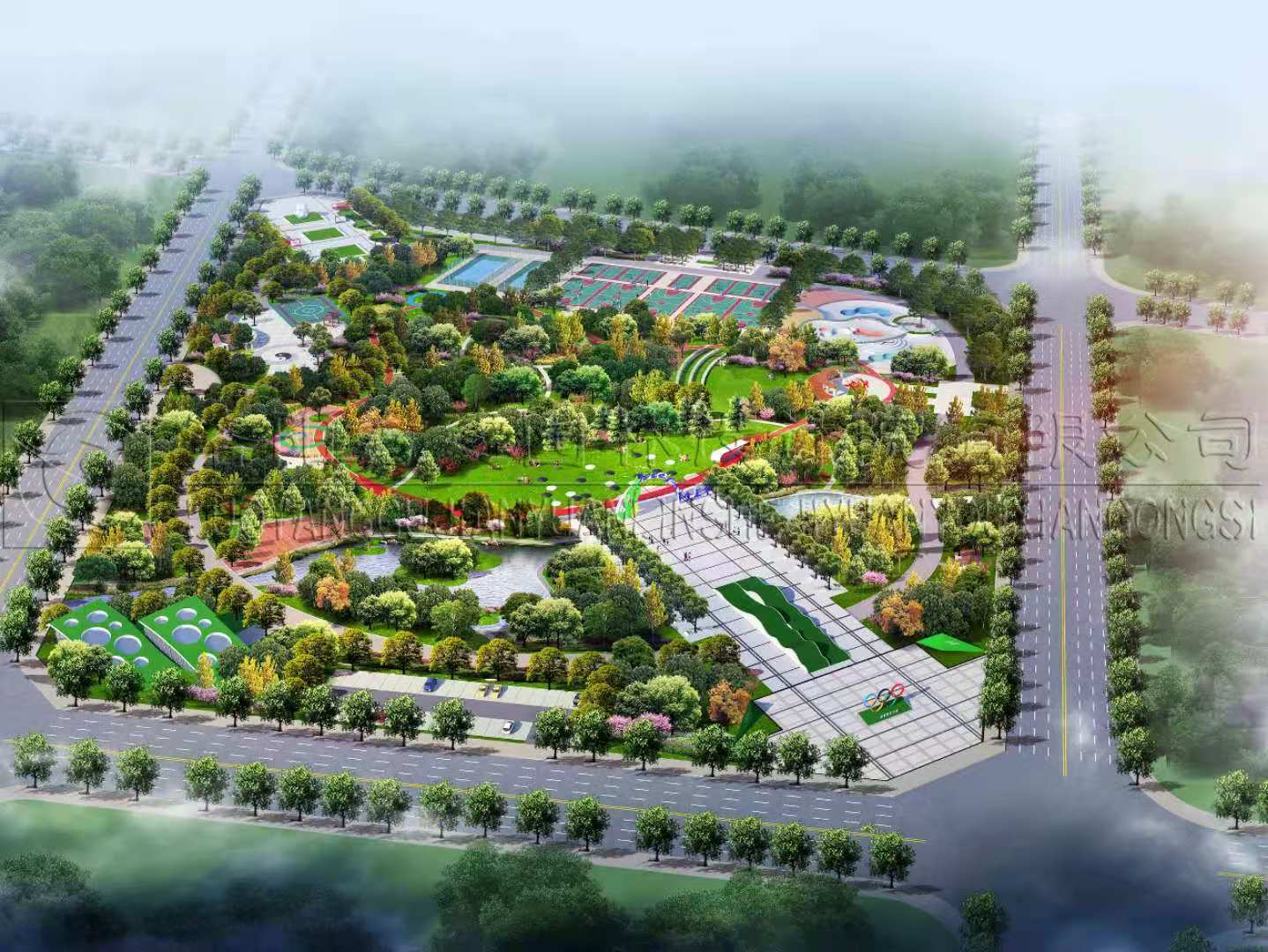 設(shè)計依托城市規(guī)劃的總體定位,“以健身運動為主,集體育、健身、休閑、娛樂為一體的開放性公園綠地”以足球、籃球、羽毛球、網(wǎng)球、排球、門球、健身路徑等露天戶外運動項目為主。